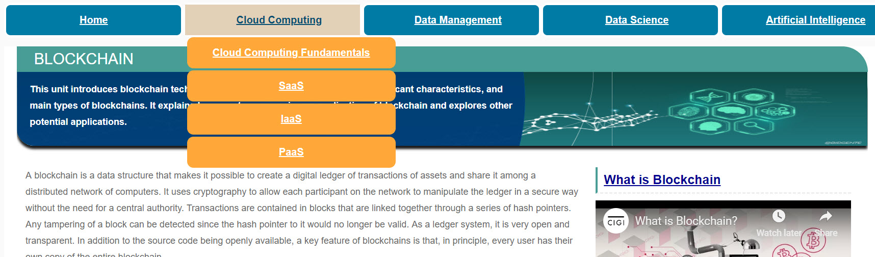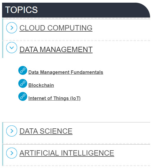 This course is structured in micro-learning units. Learning units are grouped in thematic clusters, such as Cloud computing, Data management, Data Science, and Artificial Intelligence. Within each cluster, you will have various micro-learning units, each one covering a specific topic. You can navigate freely to each of these units. From the home page, you will find a block on the right-hand side titled TOPICS showing all the different clusters and corresponding learning units. From the TOPICS block, you can visit any of the learning units.