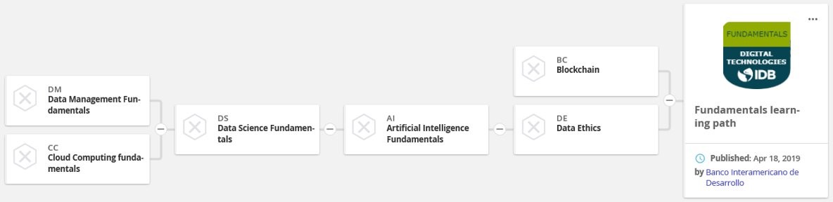 A path looks like the diagram shown below. At the end you will receive the respective digital badge. (The example below shows the Fundamentals pathway, which is the one we usually suggest to first time users.)